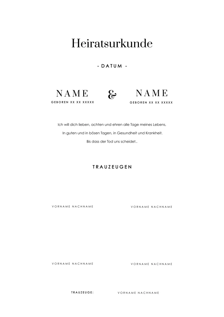 Unterschreibt an eurem Hochzeitstag auch diese inoffizielle Urkunde als Erinnerung: ein A4-Poster, das ihr später in eurem Haus aufhängen könnt. Wir empfehlen, zur Sicherheit, zwei zu bestellen.