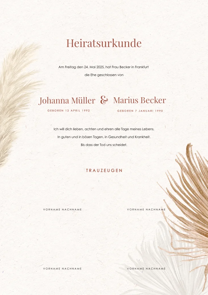 Unterschreibt an eurem Hochzeitstag auch diese inoffizielle Urkunde als Erinnerung: ein A4-Poster, das ihr später in eurem Haus aufhängen könnt. Wir empfehlen, zur Sicherheit, zwei zu bestellen.