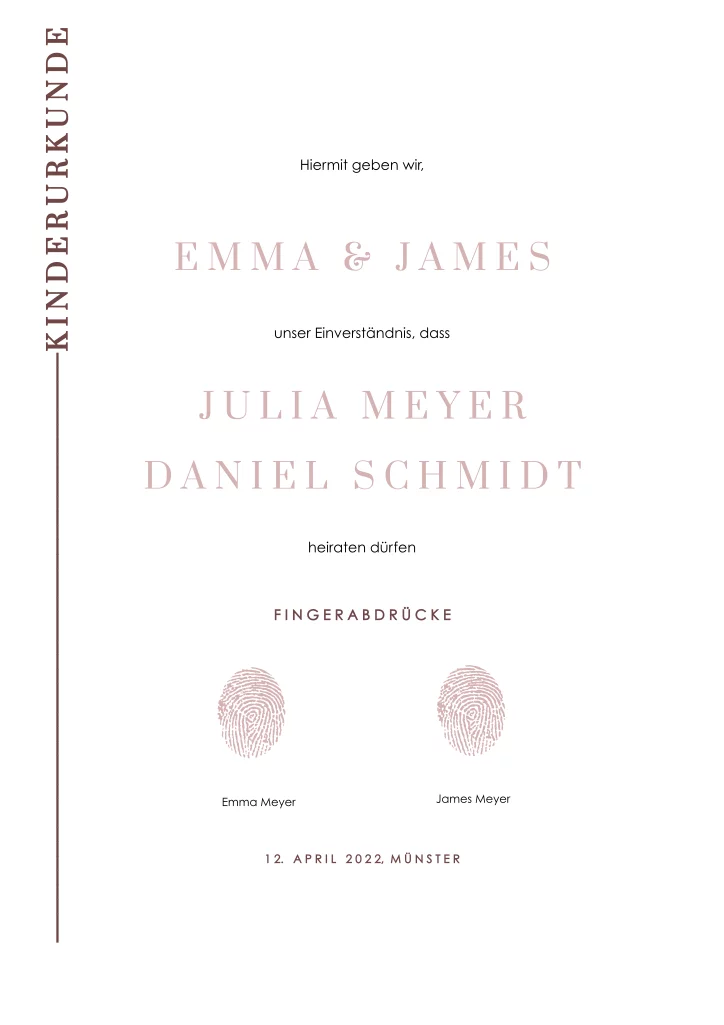 Unterschreibt an eurem Hochzeitstag auch diese inoffizielle Urkunde als Erinnerung: ein A4-Poster, das ihr später in eurem Haus aufhängen könnt. Wir empfehlen, zur Sicherheit, zwei zu bestellen.