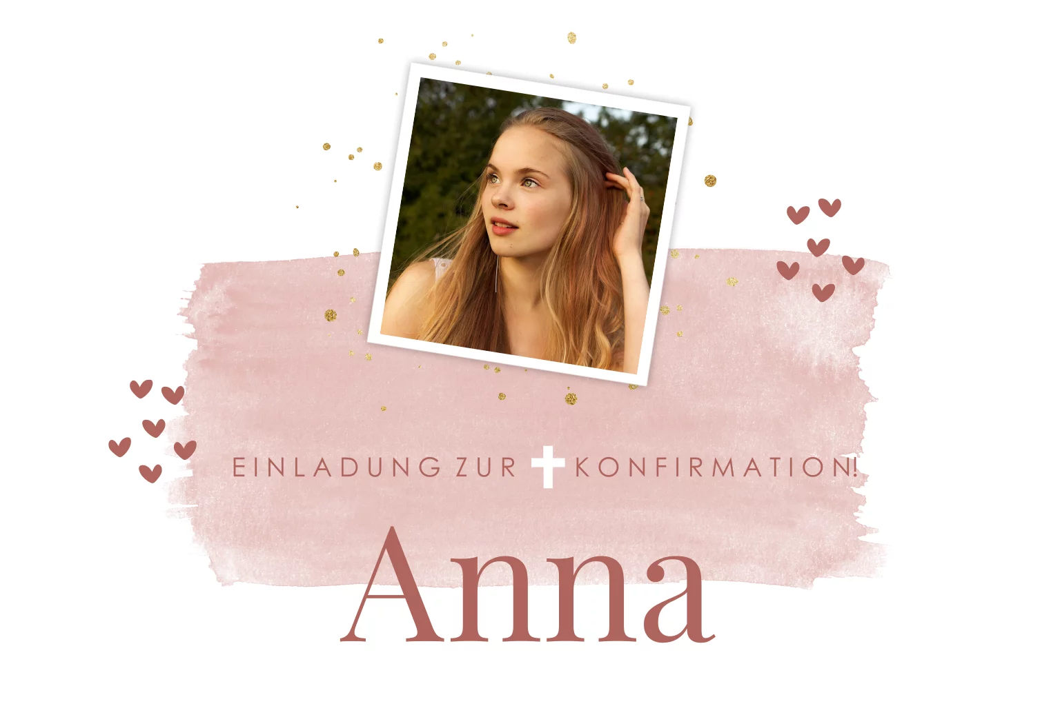 Lädst du Ihre Familie und Freundinnen mit dieser trendigen Konfirmationskarte ein. Die Karte ist mit Aquarell-Look, einem weißen Kreuz, rosa Herzen und goldgelben Farbspritzern verziert und mit abgerundeten Ecken versehen. Vervollständigt du diese Einladung, indem du Ihre eigenen Fotos und Texte in den Online-Editor einfügen.Das Design der von dir gewählten Karte wurde automatisch in andere Formate umgestellt. Wähle einfach deinen Wunschformat aus und platziere alle Texte und Elemente an der richtigen Stelle im Editor. Du hast Fragen oder dein Favorit steht nicht zur Auswahl? Dann kontaktiere uns bitte und wir werden uns gemeinsam darum kümmern!