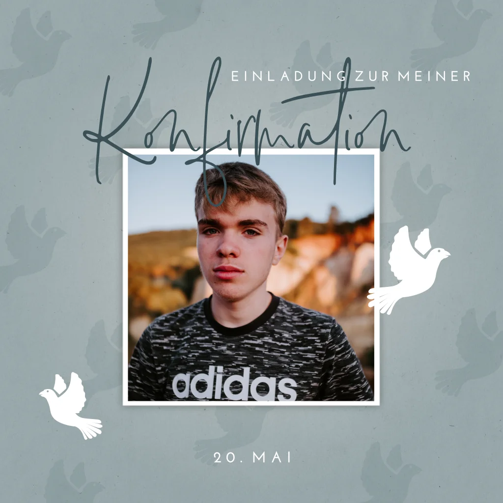 Schöne Karte mit persönlichem Foto und fliegenden Tauben auf einem blauen Hintergrund. Diese Konfirmation-Einladung ist besonders originell dank ihrer abgerundeten Ecken.