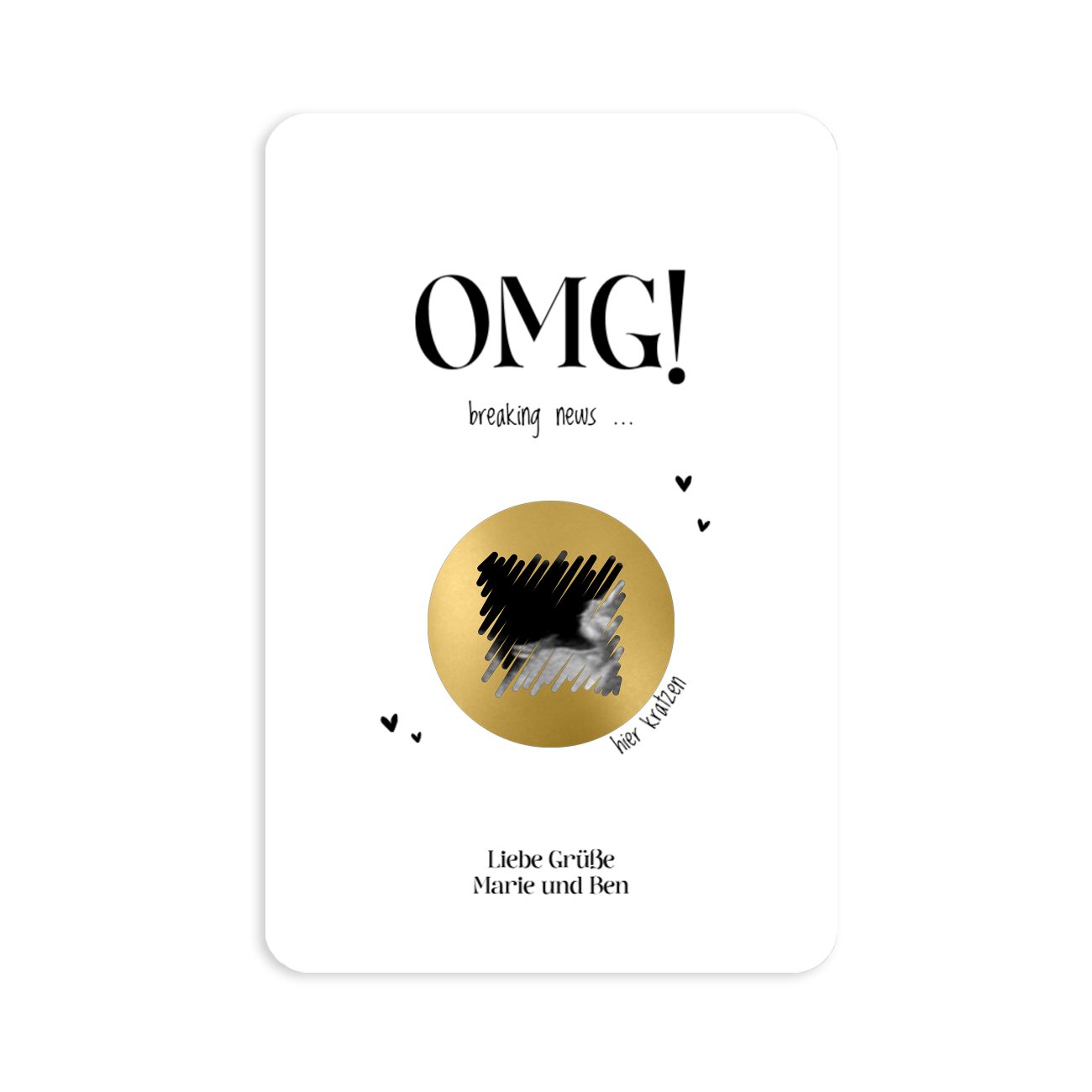 Diese Karte kann mit einem Rubbelaufkleber (Herz oder Kreis) versehen werden. So kann der Empfänger die Neuigkeiten selbst frei kratzen und auf eine einzigartige Weise entdecken, dass ein Baby unterwegs ist.