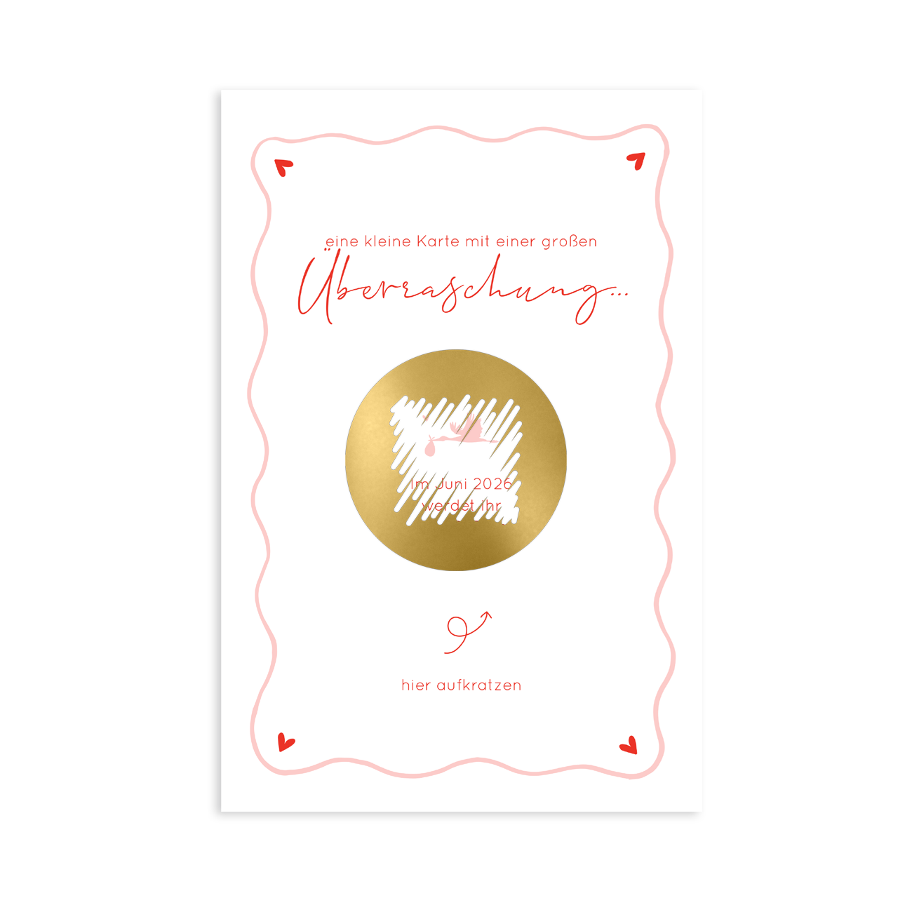 Schwangerschaftsankündigung mit welligem Rand, Herzchen und Storch als Rubbellos.