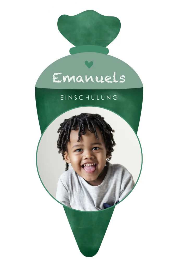 Verspielte Einladungskarte zur Einschulung. Die Karte ist gestanst in der Vorm einer Schultüte. Auf der Vorderseite gibts es Platz für in großes Foto vom Schulking. Darüber und darunter kann man den Namen, das Datum und andere Infos hinzuschreiben. Auf der Rückseite findet sich der Einladungstext. #valentina Bitte beachte: Die Form wird aus einer Karte in den angegebenen Maßen ausgestanzt; die tatsächlichen Karten sind kleiner.Das Design der von dir gewählten Karte wurde automatisch in andere Formate umgestellt. Wähle einfach deinen Wunschformat aus und platziere alle Texte und Elemente an der richtigen Stelle im Editor. Du hast Fragen oder dein Favorit steht nicht zur Auswahl? Dann kontaktiere uns bitte und wir werden uns gemeinsam darum kümmern!