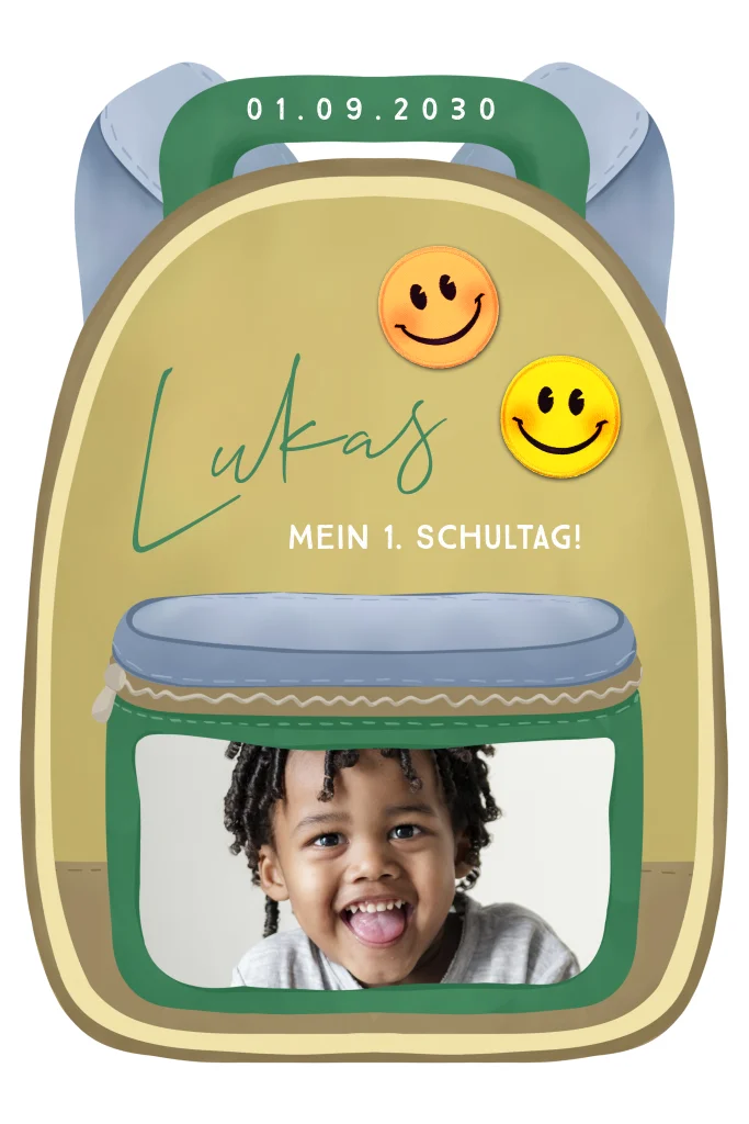 Einladung zur Einschulung als gelber Rucksack mit Smiley und Foto