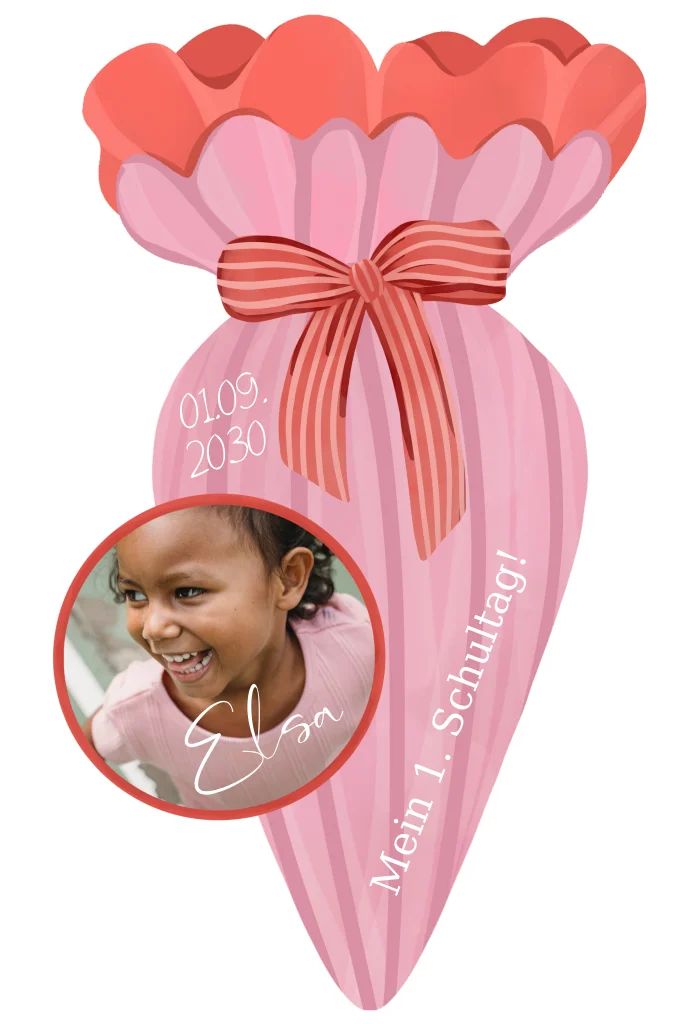 Einladung zur Einschulung als pinke Schultüte mit Foto