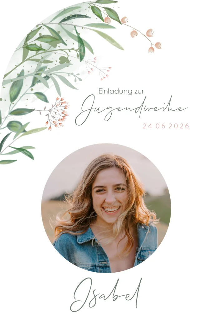Einladung zur Jugendweihe in Bogenform mit Blumen, Blättern und Foto AbmessungenDieses Produkt ist Teil des Einladungskarten-Sets Grüner Weg.