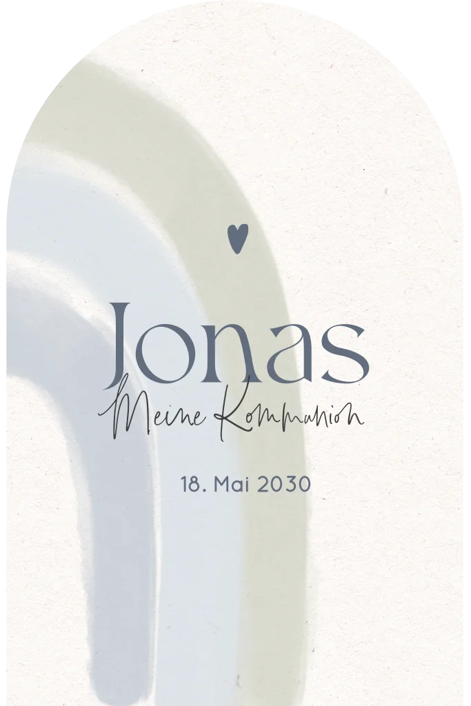 Einladung zur Kommunion in Bogenform mit blauem Aquarell-Regenbogen