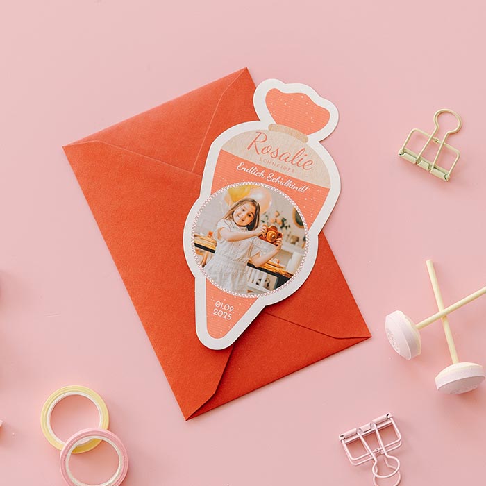 Verspielte Einladungskarte zur Einschulung. Die Karte ist gestanst in der Vorm einer Schultüte. Auf der Vorderseite gibts es Platz für in großes Foto vom Schulking. Darüber und darunter kann man den Namen, das Datum und andere Infos hinzuschreiben. Auf der Rückseite findet sich der Einladungstext. #valentinaMelde dich für unseren Newsletter an und profitiere von exklusiven Angeboten, kreativen Ideen und Neuigkeiten aus unserer Produktwelt. Als Dankeschön für deine Anmeldung schenken wir dir einen kostenlosen Probedruck deiner Karte.