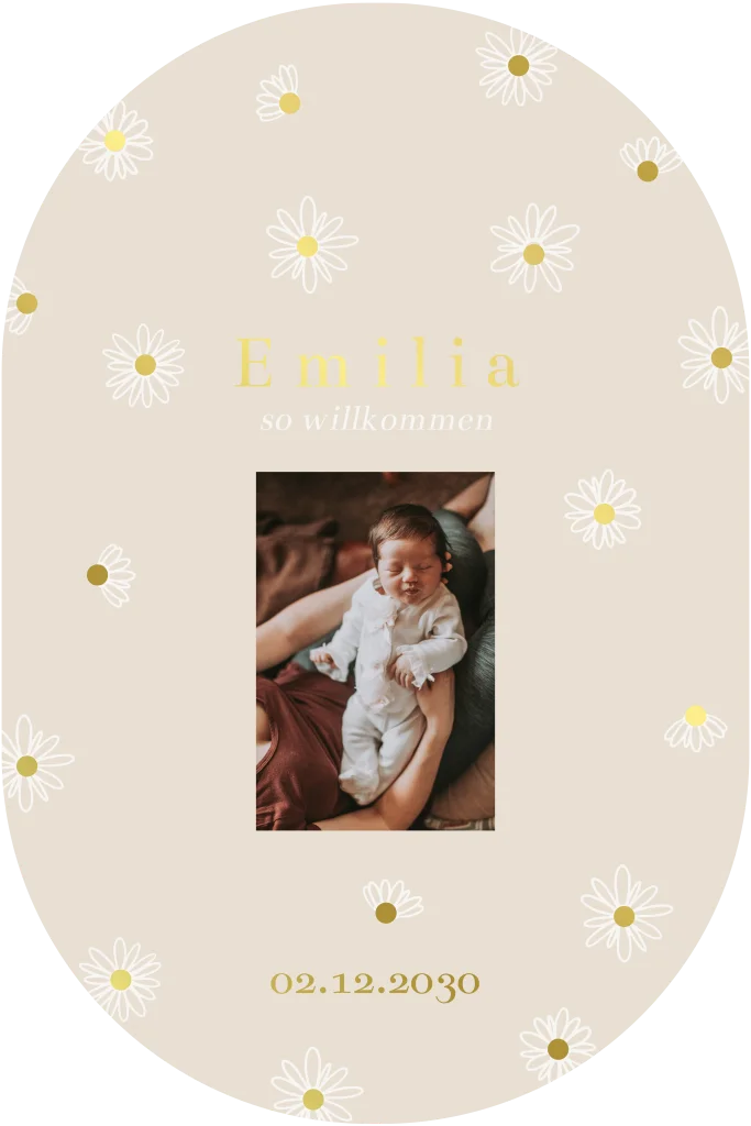 Süße Geburtskarte in ovaler Form mit auf der Vorderseite Gänseblümchen und ein Foto. Die Schrift wird in Goldfolie gedruckt. Auf der Rückseite gibt es Platz für alle wichtigen Infos. AbmessungenAuf der Suche nach mehr Inspiration? Sieh dir gerne auch unsere anderen Dankeskarten zur Geburt an.