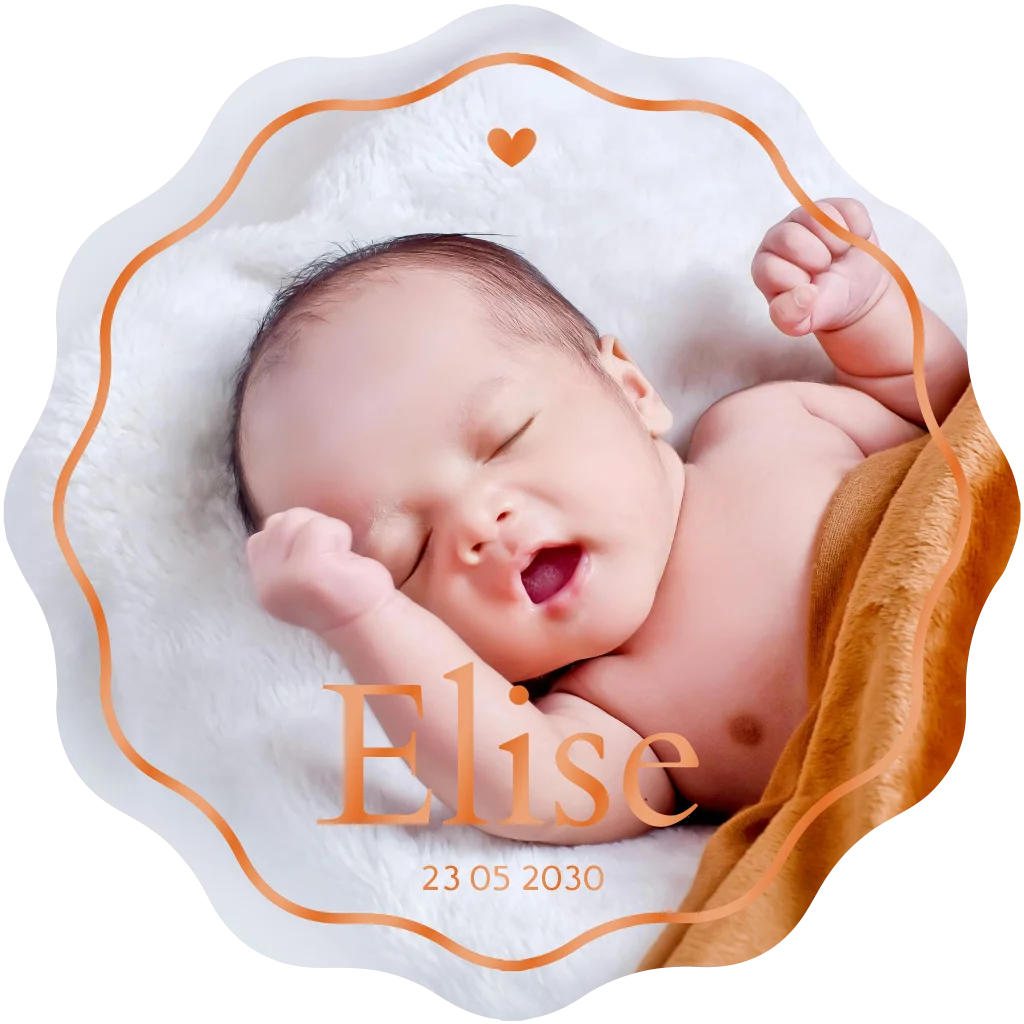 Ein stilvoller Geburtskartenklassiker mit besonderer Form: Diese Karte hat eine elegante Wellenkontur und bietet Platz für das schönste Foto deines Babys. Der Text und die feine Linie auf der Vorderseite werden mit Hochglanz veredelt – für einen edlen Effekt mit liebevollen Details.