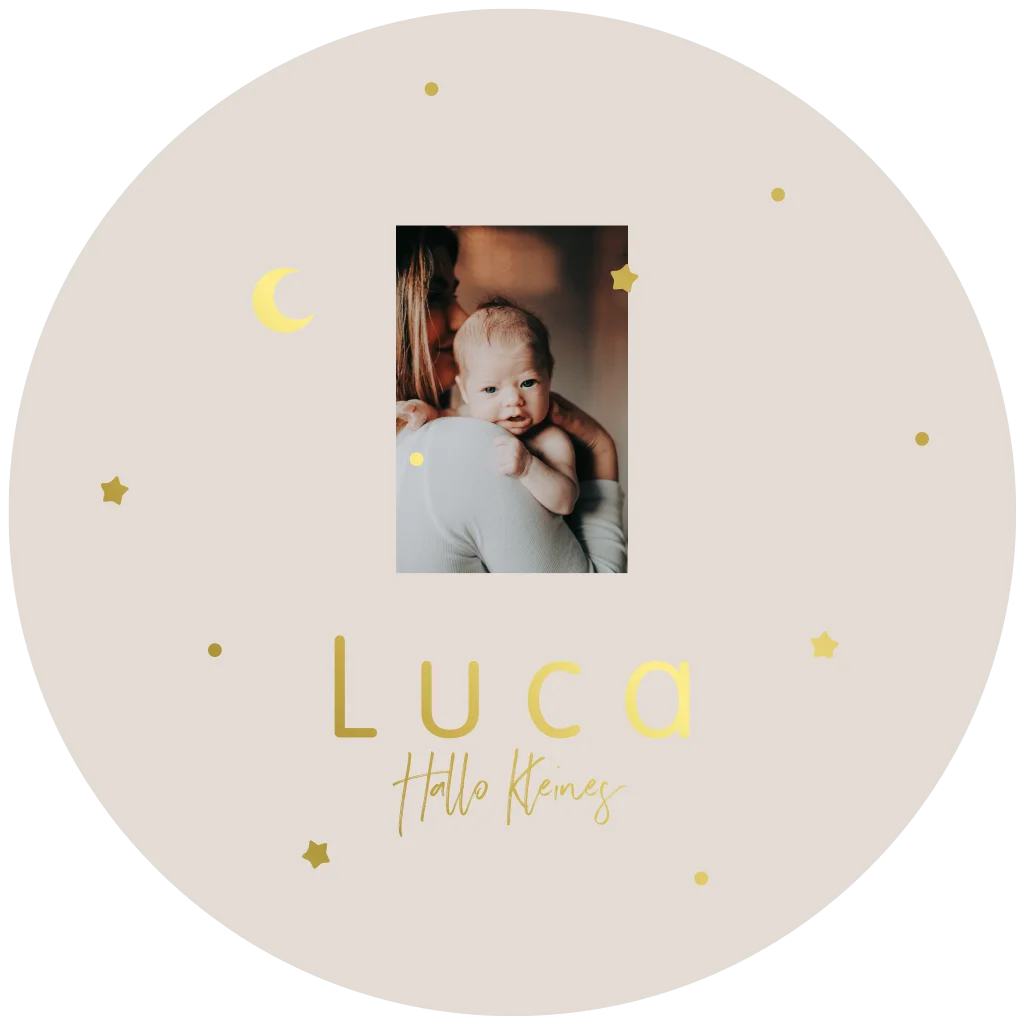 Runde Geburtskarte mit Monden, Sternen, Foto und Hochglanz