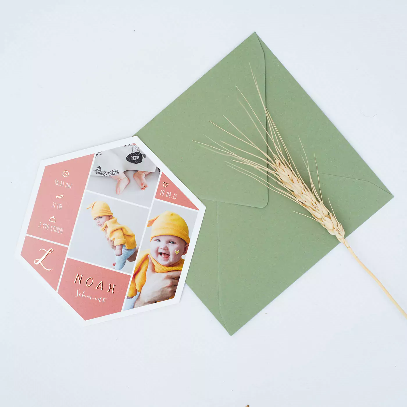 Die Geburtskarte in Hexagon-Form mit drei Fotos ist eine einzigartige Wahl, um die Ankunft eines neuen Familienmitglieds zu feiern. Mit ihrer orangenen Farbe und der eleganten Goldfolie verleiht sie jedem Raum eine warme und luxuriöse Atmosphäre. Diese Karte ist ein wunderbares Erinnerungsstück, das die schönsten Momente der ersten Tage des Babys festhält und gleichzeitig stilvoll präsentiert. Perfekt, um Familie und Freunde über die freudige Neuigkeit zu informieren!