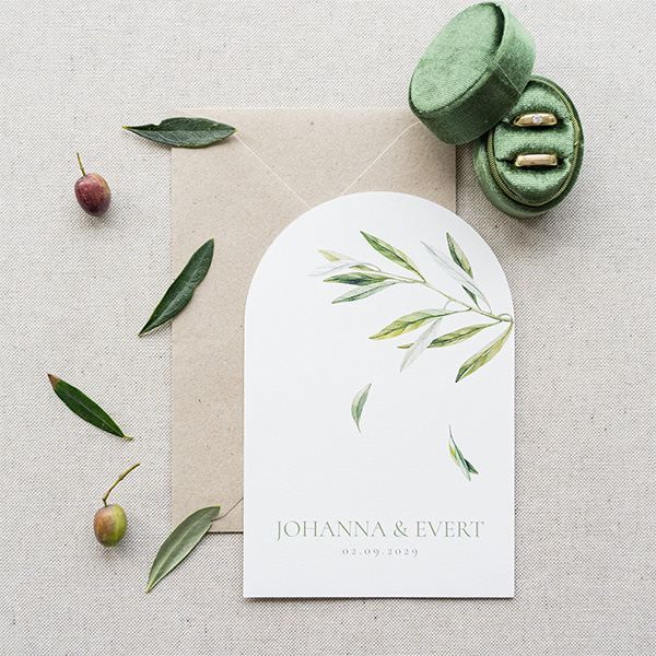 Sieh dir hier all unsere Hochzeitseinladungen mit Olivenzweigen an.