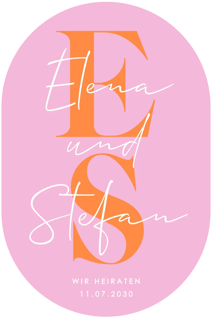 Ovale Hochzeitseinladung in Pink mit orangener und weißer Schrift. Dieses Design ist perfekt für Paare, die nach einer modernen und farbenfrohen Einladung suchen.