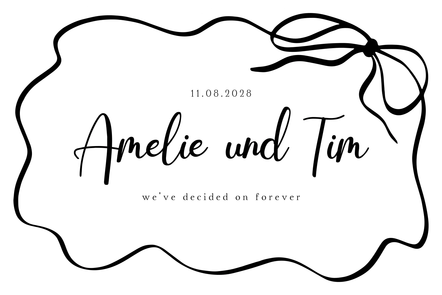 Hochzeitseinladung in ausgefallener Form mit Schleife und schwarzem Rahmen.