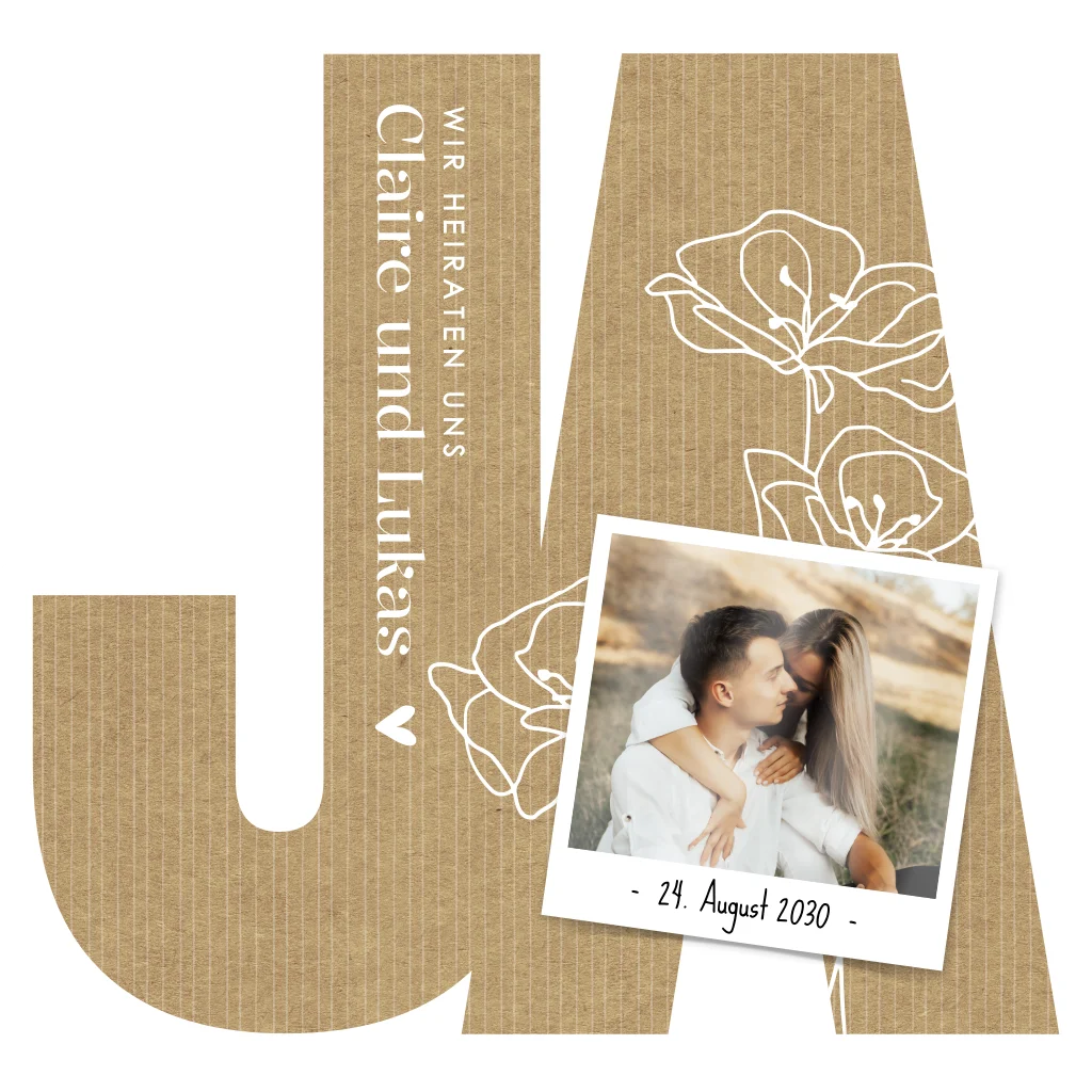 Hochzeitseinladung "JA“ mit Kraft-Look und Hochglanzfoto