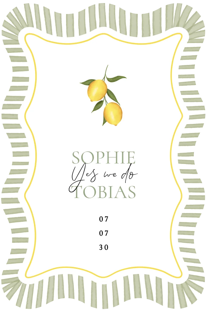 Organische Einladungskarte mit grünen Streifen und Zitronen. Dieses Design ist perfekt für Paare, die nach einer sommerlichen und verspielten Einladung suchen.