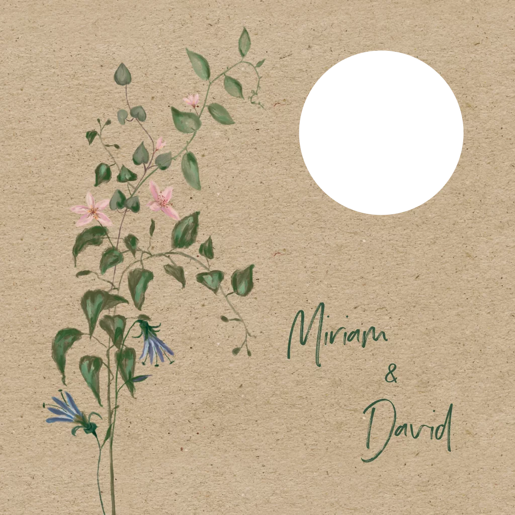 Quadratische Hochzeitseinladung mit rundem Ausschnitt und Blumen. Dieses Design ist perfekt für Paare, die nach einer schlichten und floralen Einladung suchen.Bei quadratische Karten fällt ggf. ein anderes Briefporto an. Alle Infos findest du auf der Website der Deutschen Post. Zu diesem Format erhältst du Umschläge in der Größe 14 x 12,5 cm. Format ändern ist möglich.