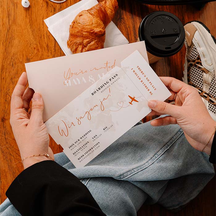 Diese stilvolle Karte im Ticket-Look mit Weltkarte im Beigetönen und Hochglanz ist die perfekte, einzigartige Art, eure Hochzeit anzukündigen! Passe das Design einfach im Editor an.