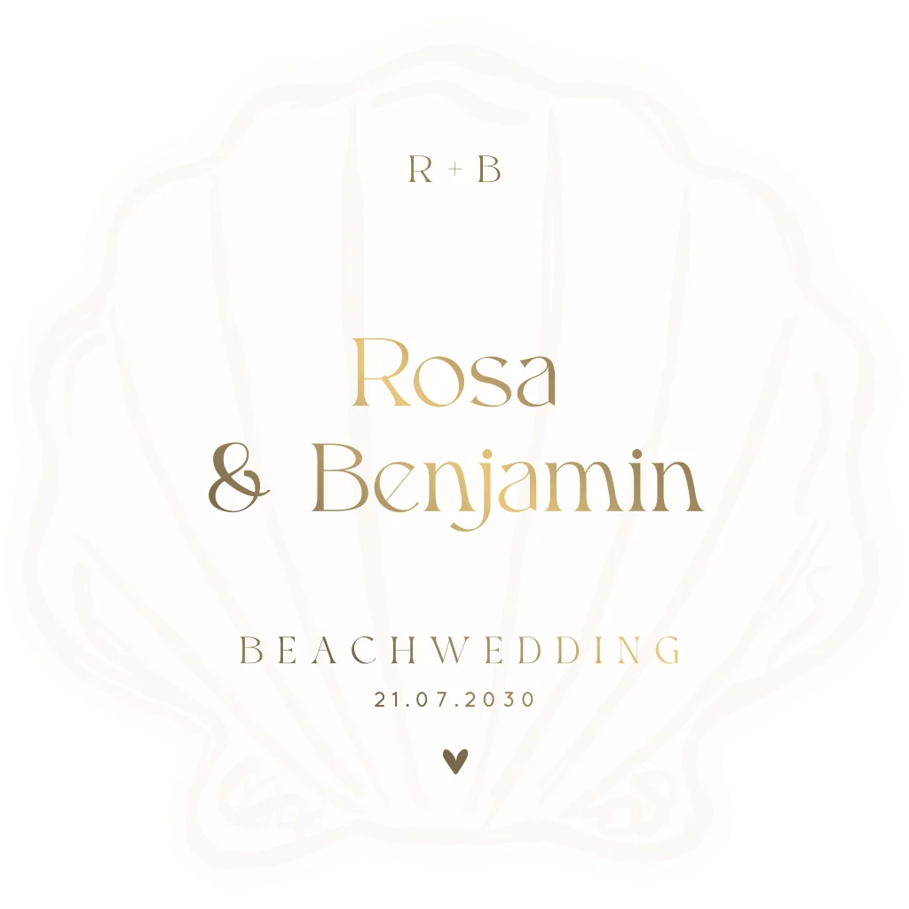 Plant ihr eine Beach Wedding? Dann ist diese Muschelkarte die perfekte Hochzeitskarte für eure Feier. Die Muschelform in Kombination mit der Mattgoldfolie macht diese Karte besonders. Etwas ändern? Das geht ganz einfach im Online-Editor.