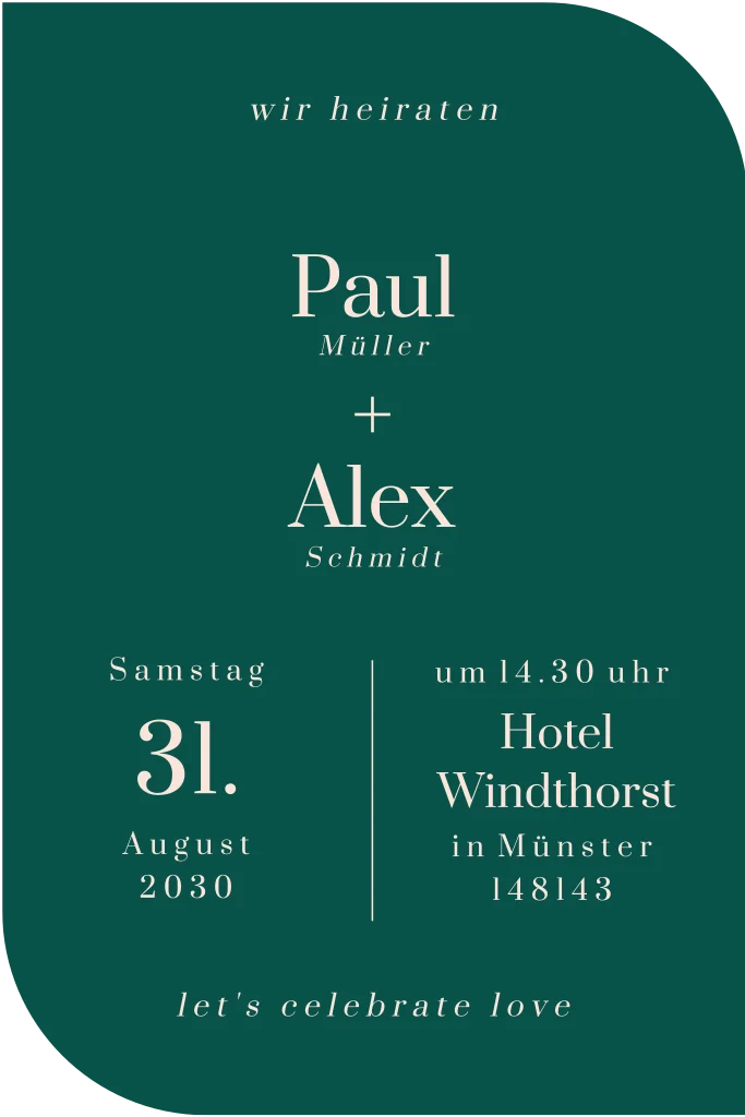 Hochzeitseinladung in Waldgrün mit runden Ecken. Dieses Design ist perfekt für Paare, die nach einer modernen und ausgefallenen Einladung suchen.Melde dich für unseren Newsletter an und profitiere von exklusiven Angeboten, kreativen Ideen und Neuigkeiten aus unserer Produktwelt. Als Dankeschön für deine Anmeldung schenken wir dir einen kostenlosen Probedruck deiner Karte.