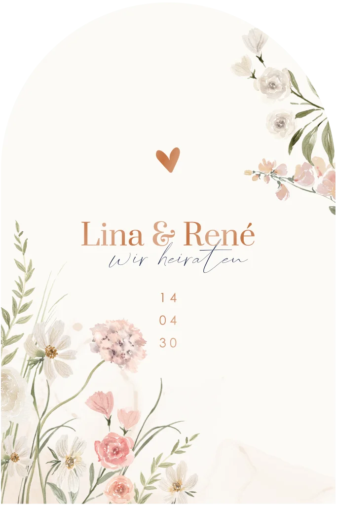 Romantische Hochzeitskarte in Bogenform Aquarellblumen und Hochglanz