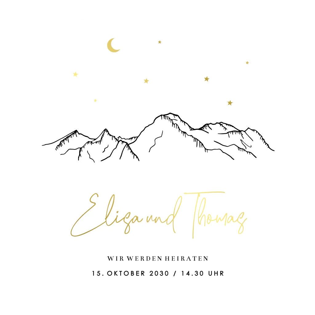 Moderne runde Hochzeitskarte mit Text in Goldfolie und Berglandschaft, die auch auf der Rückseite zu sehen ist.Melde dich für unseren Newsletter an und profitiere von exklusiven Angeboten, kreativen Ideen und Neuigkeiten aus unserer Produktwelt. Als Dankeschön für deine Anmeldung schenken wir dir einen kostenlosen Probedruck deiner Karte.