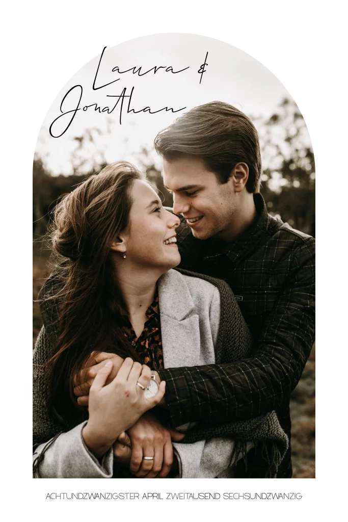Schlichte Einladung zur Hochzeit in Bogenform mit Foto. Dieses Design ist perfekt für Paare, die nach einer stilvollen und modernen Einladung suchen.
