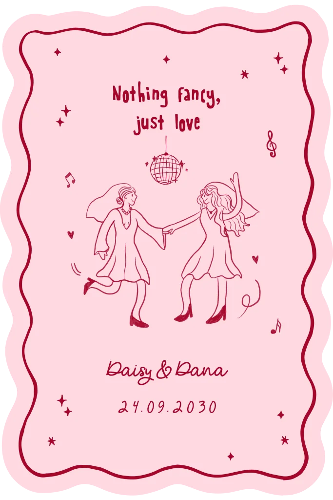 Verspielte Hochzeitseinladung in Pink mit Illustrationen und gewelltem Rand