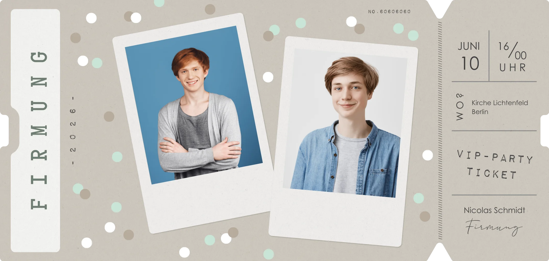 Einladung zur Firmung mit zwei Fotos und Konfetti Print im Ticket-Look.Das Design der von dir gewählten Karte wurde automatisch in andere Formate umgestellt. Wähle einfach deinen Wunschformat aus und platziere alle Texte und Elemente an der richtigen Stelle im Editor. Du hast Fragen oder dein Favorit steht nicht zur Auswahl? Dann kontaktiere uns bitte und wir werden uns gemeinsam darum kümmern!