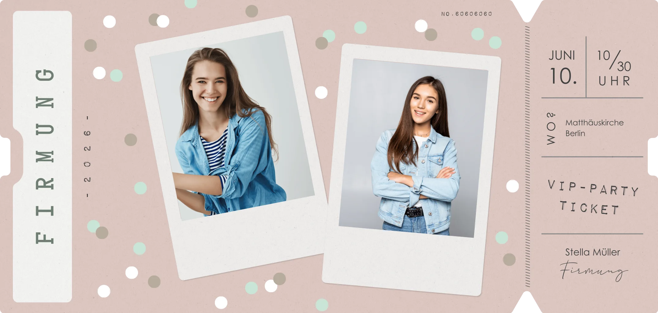 Einladung zur Firmung mit zwei Fotos und Konfetti Print im rosa Ticket-Look.Melde dich für unseren Newsletter an und entdecke exklusive Angebote, kreative Inspirationen und spannende Neuigkeiten aus unserer Produktwelt. Als Dankeschön erhältst du 5 € Rabatt auf deine nächste Bestellung.