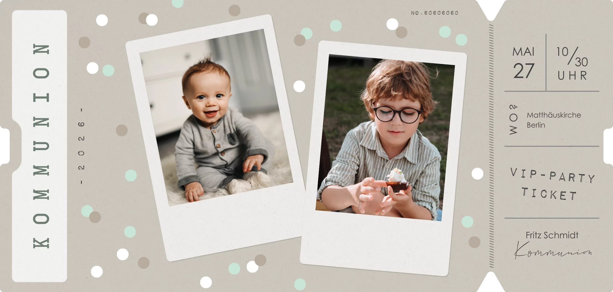 Einladung zur Kommunionfeier mit zwei Fotos und Konfetti Print im Ticket-Look.Melde dich für unseren Newsletter an und profitiere von exklusiven Angeboten, kreativen Ideen und Neuigkeiten aus unserer Produktwelt. Als Dankeschön für deine Anmeldung schenken wir dir einen kostenlosen Probedruck deiner Karte.