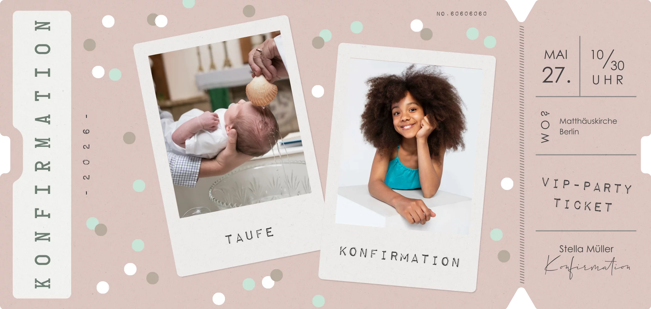Einladung zur Konfirmation mit zwei Fotos und Konfetti Print im rosa Ticket-LookMelde dich für unseren Newsletter an und profitiere von exklusiven Angeboten, kreativen Ideen und Neuigkeiten aus unserer Produktwelt. Als Dankeschön für deine Anmeldung schenken wir dir einen kostenlosen Probedruck deiner Karte.