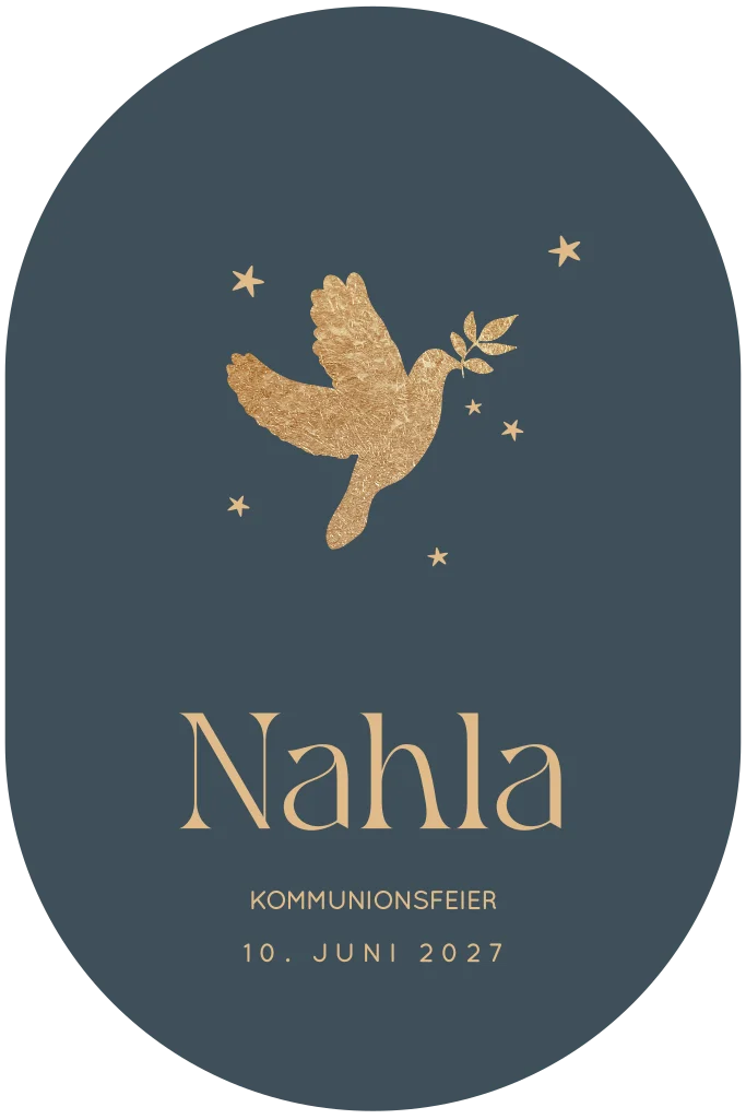 Ovale Einladungskarte zur Kommunion mit goldener Taube und Sternen