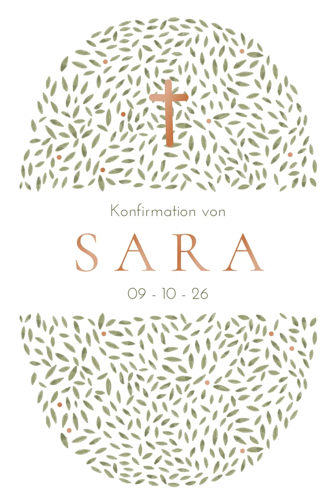 Ovale Einladungskarte zur Konfirmation mit Kreuz, Blättchen und Foto