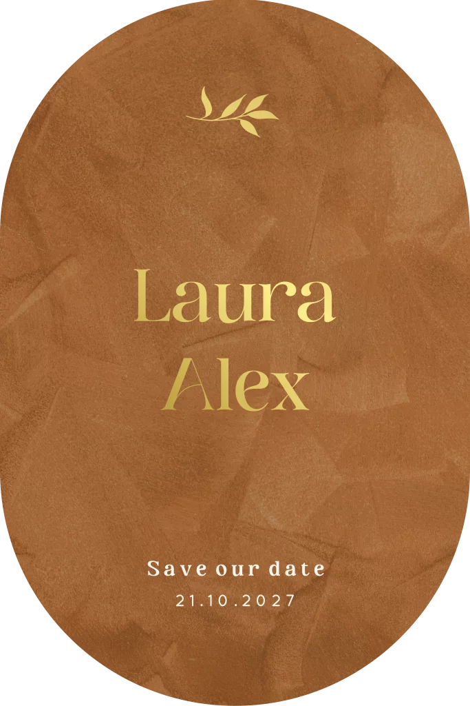 Elegante Save the Date Karte in ovaler Form und Elementen aus Goldfolie. Abmessungen