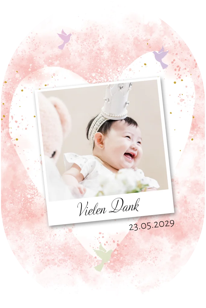Die Dankeskarte zur Taufe ist eine ovale Karte, die auf der Vorderseite mit einem rosanen, herzförmigen Umriss gestaltet ist. Im Zentrum der Karte ist ein Foto platziert. Über und unter dem Foto sind holografische Tauben zu sehen, die der Karte einen besonderen Glanz verleihen. Die Rückseite der Karte ist mit einer weißen Taube auf einem rosa Aquarell-Hintergrund gestaltet. Die Karte eignet sich perfekt, um sich bei Freunden und Verwandten für ihre Unterstützung und Liebe während der Taufzeremonie zu bedanken. AbmessungenMelde dich für unseren Newsletter an und entdecke exklusive Angebote, kreative Inspirationen und spannende Neuigkeiten aus unserer Produktwelt. Als Dankeschön erhältst du 5 € Rabatt auf deine nächste Bestellung.