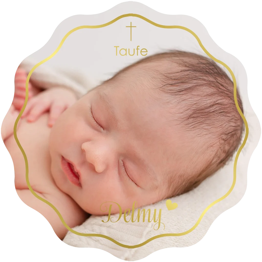 Diese hübsche, unisex Taufkarte begeistert mit ihrer gestanzten Form und sanft geschwungenen Rändern. Auf der Vorderseite findest du Platz für ein schönes Foto deines Kindes. Der Name wird in edler Goldfolie veredelt – alternativ kannst du auch Roségold, Silber oder Hochglanz wählen.