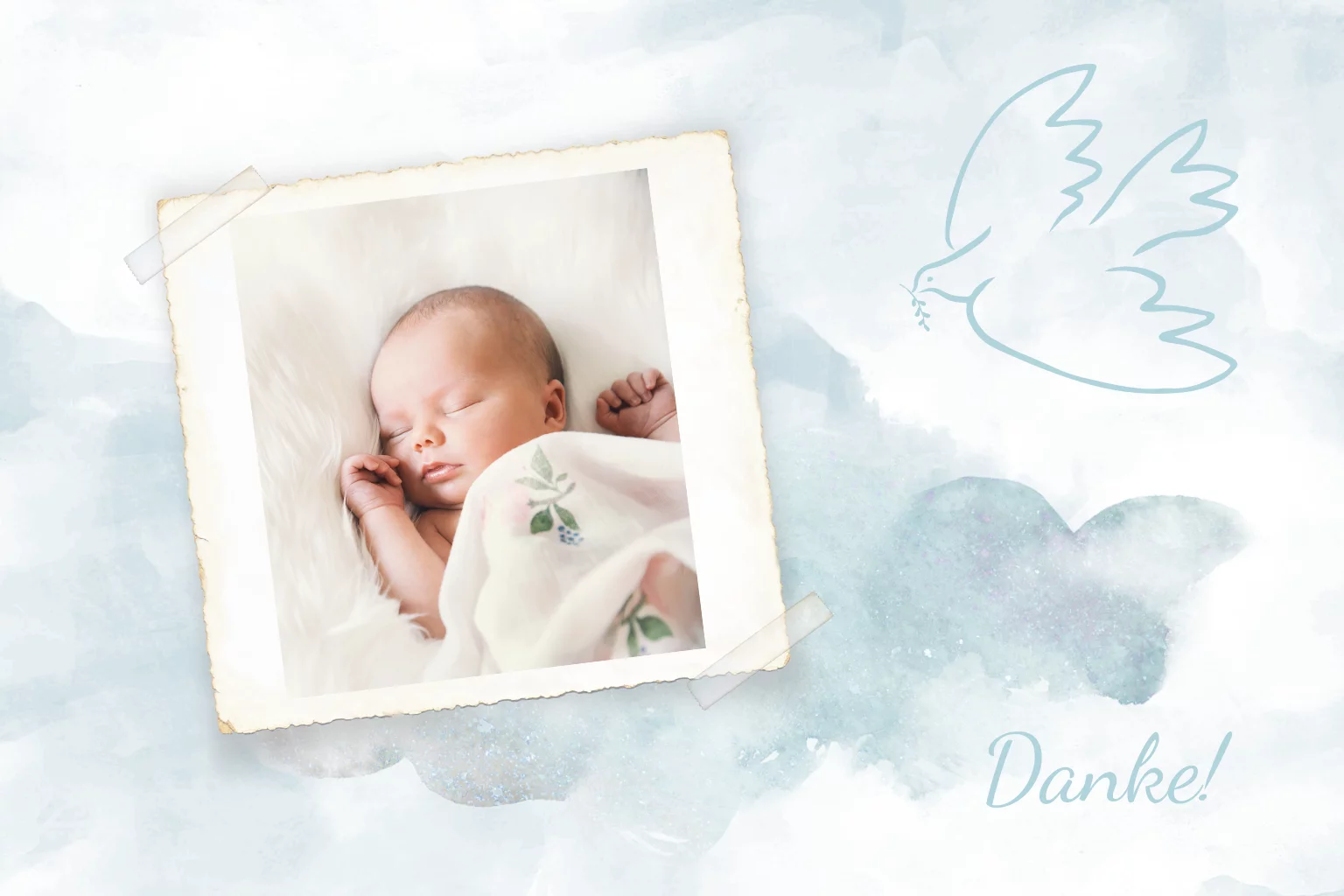 Dankeskarte Taufe mit Foto, Taube und blauem Aquarell-LookMelde dich für unseren Newsletter an und profitiere von exklusiven Angeboten, kreativen Ideen und Neuigkeiten aus unserer Produktwelt. Als Dankeschön für deine Anmeldung schenken wir dir einen kostenlosen Probedruck deiner Karte.