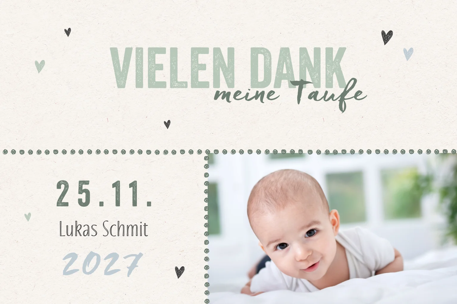 Dankeskarte zur Taufe mit salbeigrüner Schrift und FotoMelde dich für unseren Newsletter an und entdecke exklusive Angebote, kreative Inspirationen und spannende Neuigkeiten aus unserer Produktwelt. Als Dankeschön erhältst du 5 € Rabatt auf deine nächste Bestellung.