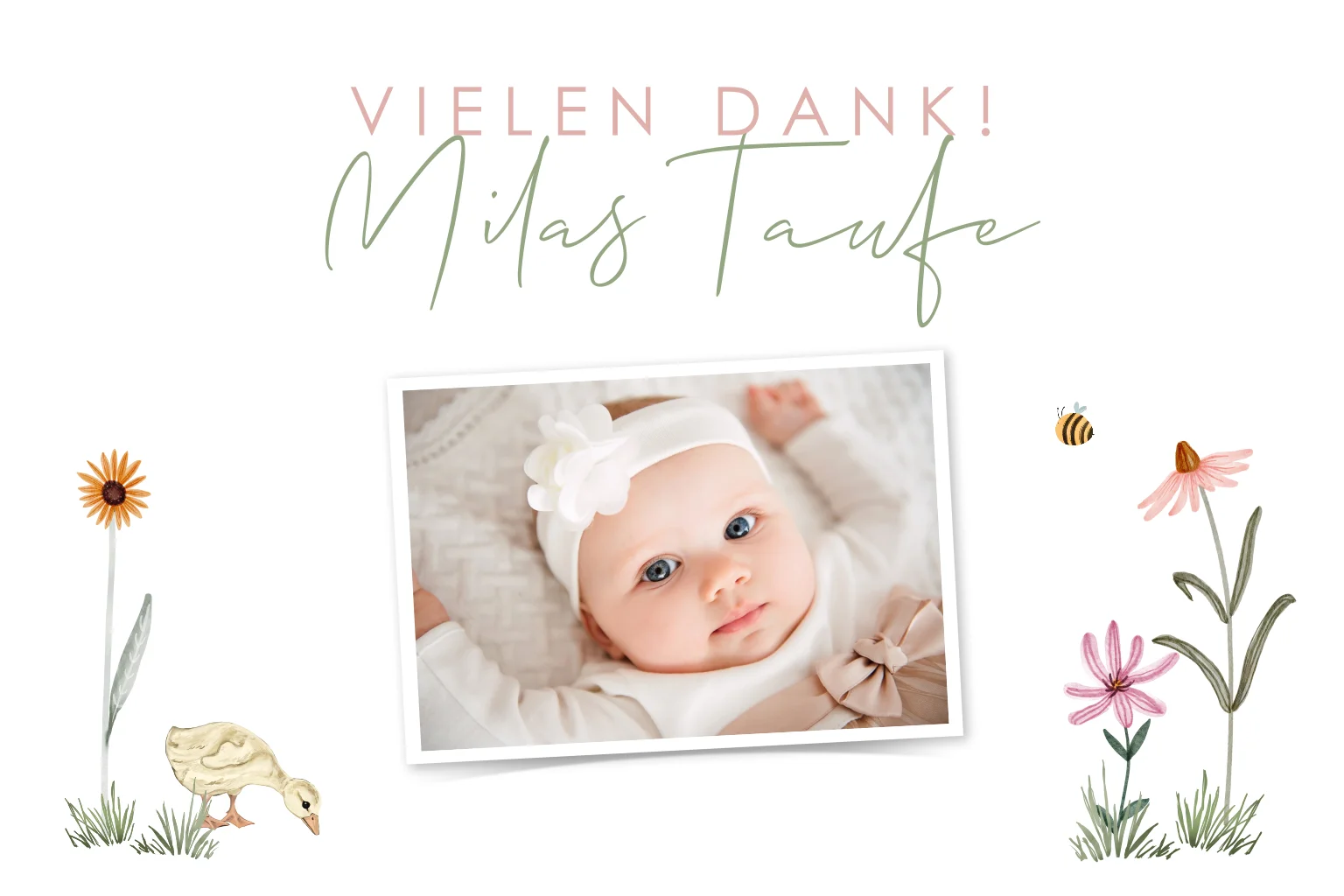 Süße Dankeskarte Taufe mit Entchen, Bienchen und BlumenMelde dich für unseren Newsletter an und entdecke exklusive Angebote, kreative Inspirationen und spannende Neuigkeiten aus unserer Produktwelt. Als Dankeschön erhältst du 5 € Rabatt auf deine nächste Bestellung.