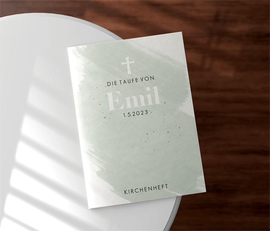 Das Kirchenheft wird durch zwei Heftklammern stabil zusammengehalten und kann sowohl auf Papier mit matter Oberfläche (Holzfreies Papier 170g/m²) als auch auf Papier mit glattem, leicht glänzendem Papier (Seidenglanz 170g/m²) gedruckt werden. Du kannst dabei zwischen einem 8- als auch einem 12-seitigen Kirchenheft aus unserem Sortiment wählen. Diese Version hier hat 8 Seiten; wenn du lieber 12 Seiten möchtest, kontaktiere uns bitte