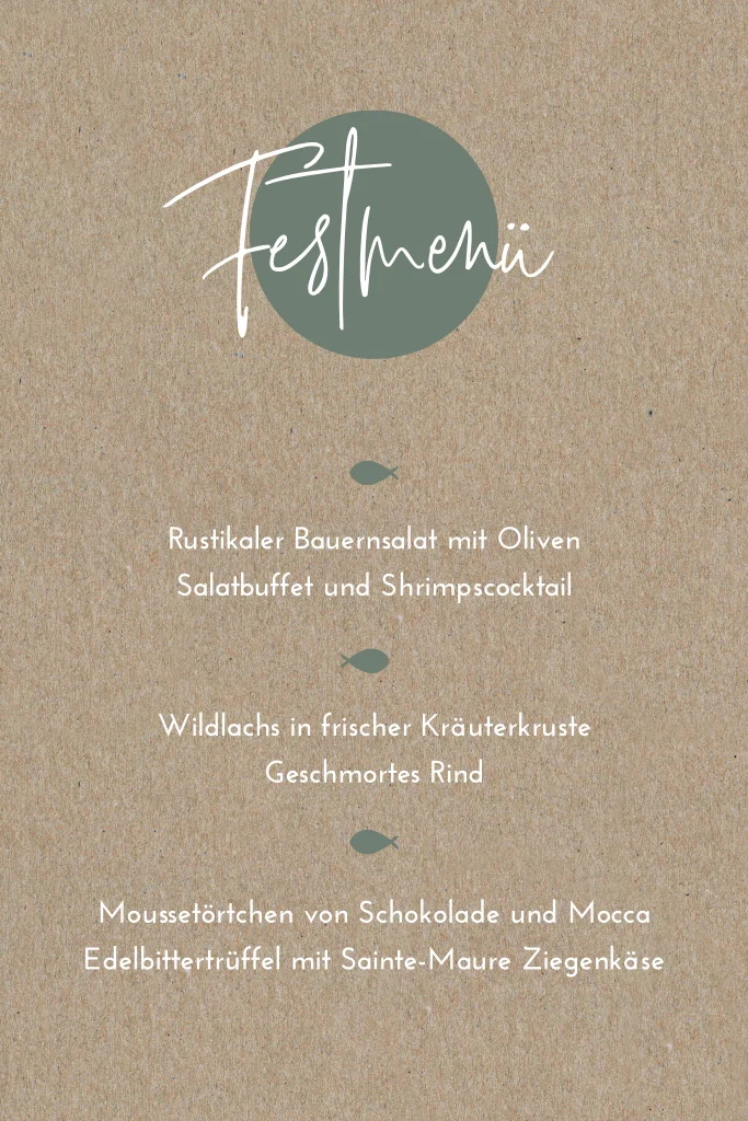 Menükarte zur Taufe im Kraft-Look mit Ichthys Fischen