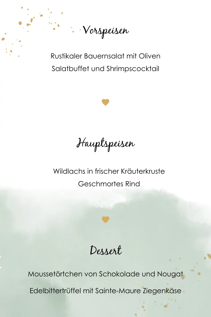 Menükarte zur Taufe im Aquarell-Look mit Herzchen und Farbklechsen