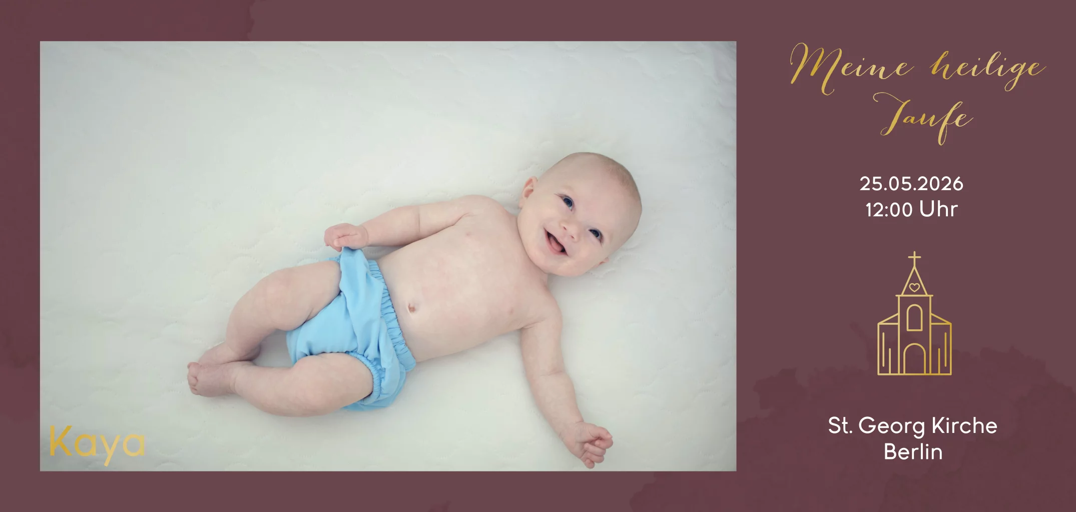 Auf der Vorderseite siehst du ein Foto und die Schrift und Kirche sind teilweise versehen von Hochglanz Farbe. Auf der Rückseite hast du Platz für alle wichtigen Infos.Das Design der von dir gewählten Karte wurde automatisch in andere Formate umgestellt. Wähle einfach deinen Wunschformat aus und platziere alle Texte und Elemente an der richtigen Stelle im Editor. Du hast Fragen oder dein Favorit steht nicht zur Auswahl? Dann kontaktiere uns bitte und wir werden uns gemeinsam darum kümmern!