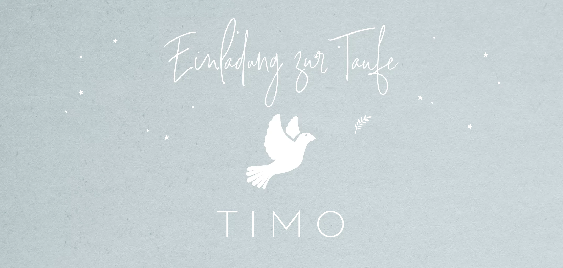 Auf der Vorderseite der Taufeinladung ist eine weiße Taube auf einem blauen Hintergrund zu sehen. Die Schrift ist mit Goldfolie verziert, was der Einladung einen edlen Touch verleiht. Auf der Rückseite befindet sich ein Foto mit einer weiteren Taube und Sternen. Der Einladungstext ist ebenfalls auf der Rückseite. Diese Einladung ist perfekt für eine Taufe, die elegant und stilvoll sein soll.Melde dich für unseren Newsletter an und profitiere von exklusiven Angeboten, kreativen Ideen und Neuigkeiten aus unserer Produktwelt. Als Dankeschön für deine Anmeldung schenken wir dir einen kostenlosen Probedruck deiner Karte.