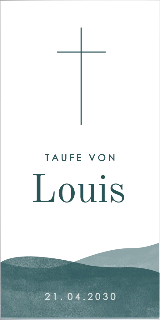 Moderne Taufkerze mit Kreuz und Meereswellen, 20 cm hoch, 8 cm Ø