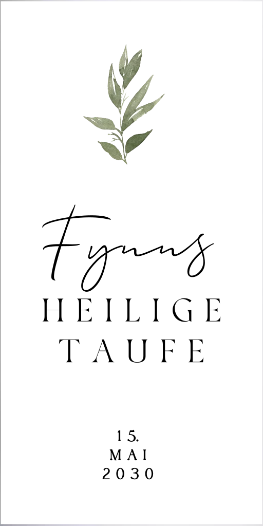 Moderne Taufkerze mit Namen und Olivenzweig 20 cm hoch, 8 cm Ø