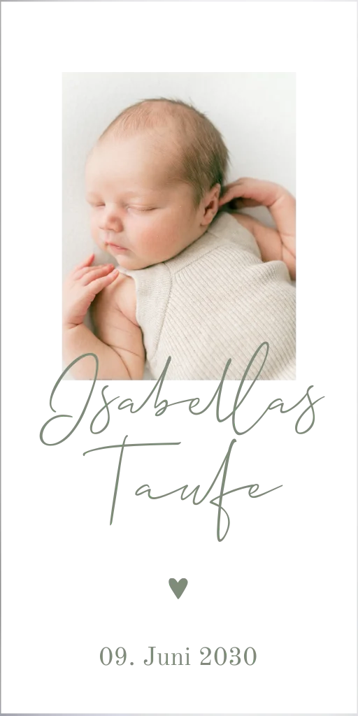 Taufkerze mit Foto und grüner Schrift - 20 cm hoch, 8 cm Ø